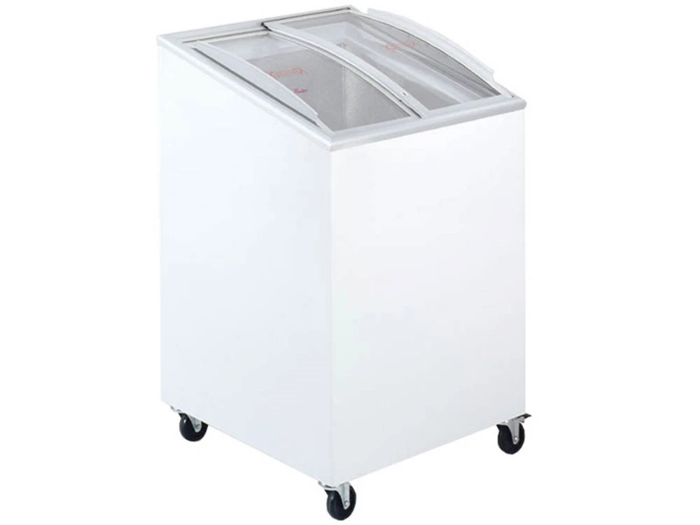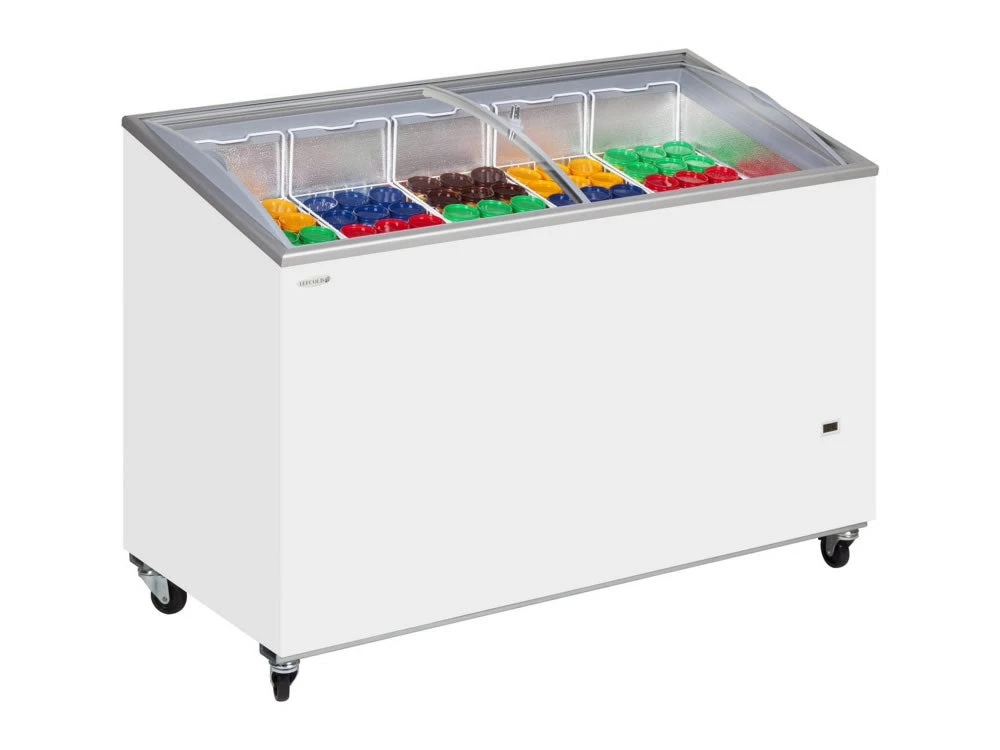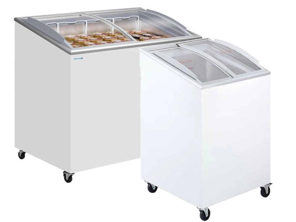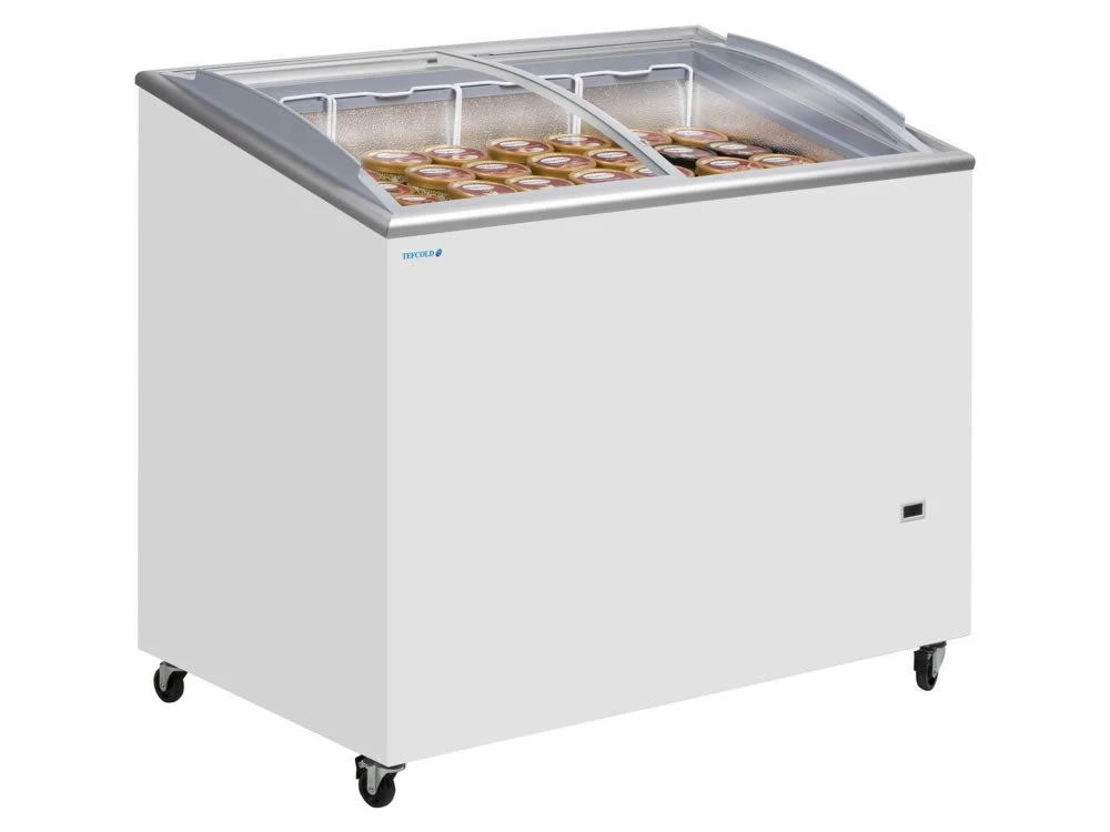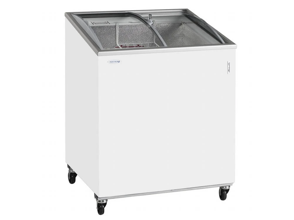 Tefcold SCEB Range Sliding Curved Glass Lid Chest Freezer – An excellent choice of sliding glass lid chest freezers similar to the IC-SC range but with sloping top for a better visual display, and curved lids which always look better. Ideal for display of frozen food including ice cream and lollies.